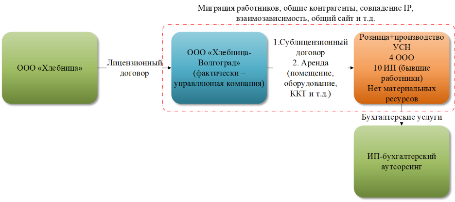 Например, ИП после отмены ЕНВД прекратил розничную торговлю и заключил договоры аренды и коммерческой концессии со своими бывшими работниками. Когда ИП достигали лимита по УСН, регистрировались новые ИП. Работники к новым ИП-пользователям переходили вместе с магазинами от проверяемого налогоплательщика. Также были выявлены иные «классические» признаки дробления: