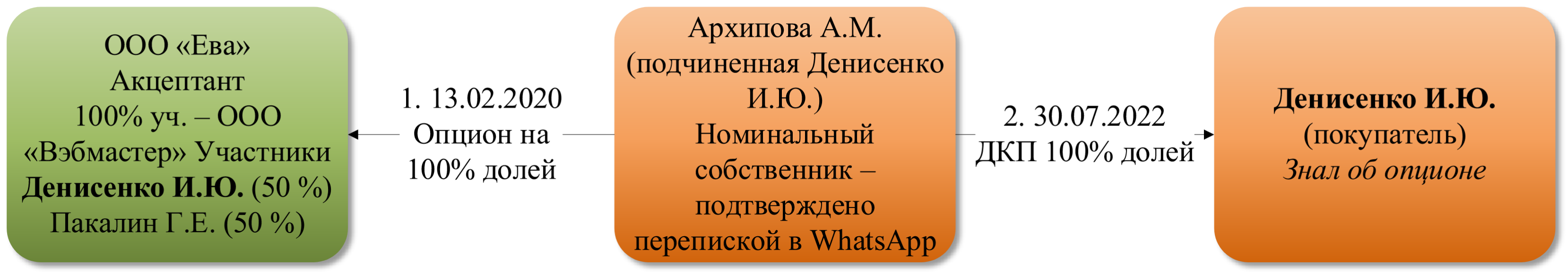 Так ООО «Ева» заключило опцион на 100% долей в уставном капитале ООО «Экоархитектура» с Архиповой А.М. Несмотря на то, что договором был предусмотрен запрет на продажу долей, Архипова А.М. продала их Денисенко И.Ю. Однако Денисенко И.Ю. был одновременно 50% учредителем ООО «Вэбмастер», которому на 100% принадлежало ООО «Ева». То есть Денисенков И.Ю. было известно об опционе, но несмотря на это он все равно купил доли у Архиповой А.М.